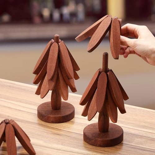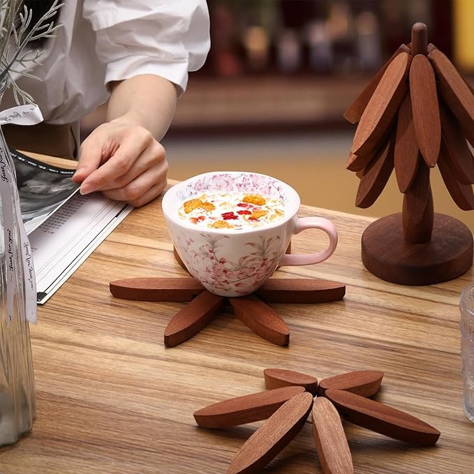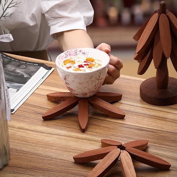 - Versatile: This wooden trivet set features a tree-shaped holder and 5 flower-shaped coasters, perfect for protecting surfaces from hot dishes and cups.