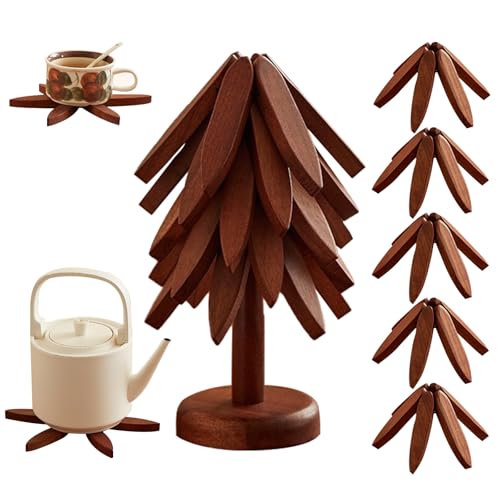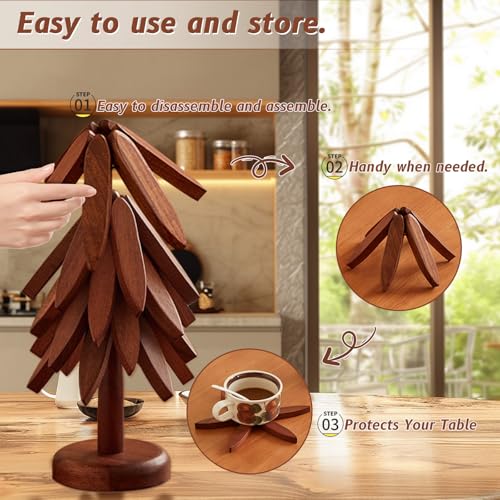 IREMATE - Wooden Trivets for Hot Dishes, Tree Coasters Tree Shape Trivet Set, Trivets for Hot Dishes, Foldable Kitchen Tree Table Mat for Easy Storage, Coaster with 5 Wooden Trivets,1 Stand