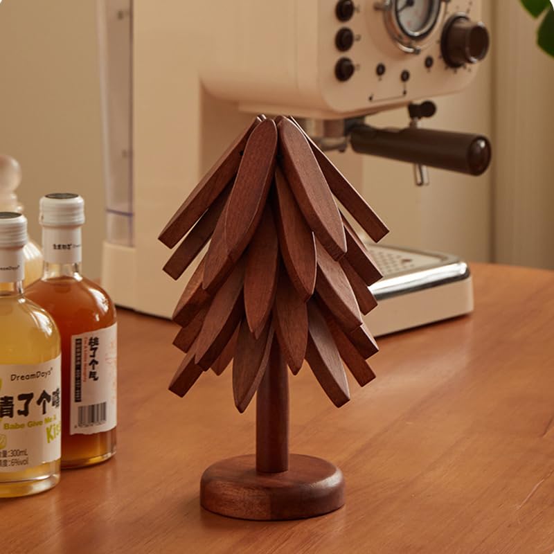 - 【Easy to Use and Store】 It's simple to use and store. It's really simple to use. The rubber band unfolds itself when the hot pot is placed on the coaster tree. When you remove it, it retracts under the pull of the rubber band, shielding your countertop or table from harm from high temperatures. The tree coasters take up very little room when stored on the stand when not in use.