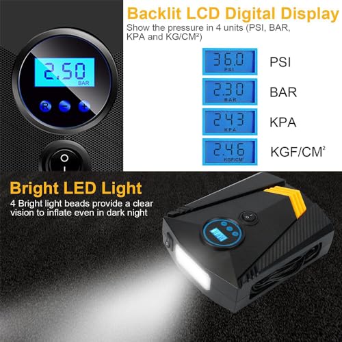- [نفخ سريع واستخدام واسع]: املأ إطار السيارة من 0 رطل لكل بوصة مربعة إلى 36 رطل لكل بوصة مربعة في 5-10 دقائق أو 29-36 رطل لكل بوصة مربعة في دقيقة واحدة. يمكن استخدامها في السيارات، والموتوسيكلات، والدراجات، والقوارب القابلة للنفخ، والكرات وغيرها من المعدات المختلفة.