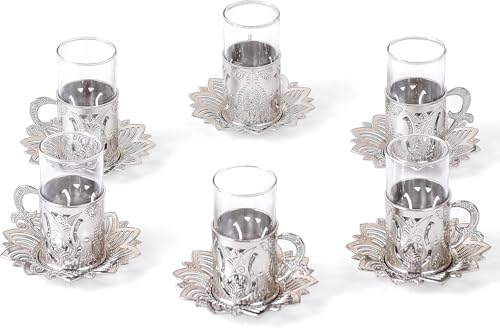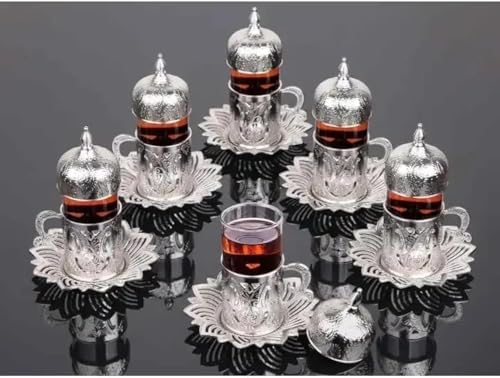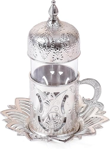 Home and Kitchen Art - طقم شاى مغطي فضي عدد 12 قطع ( 6 كوب زجاج بالغطاء والحامل + 6 طبق للاكواب) سعة 80 ملى لتر H&k Art