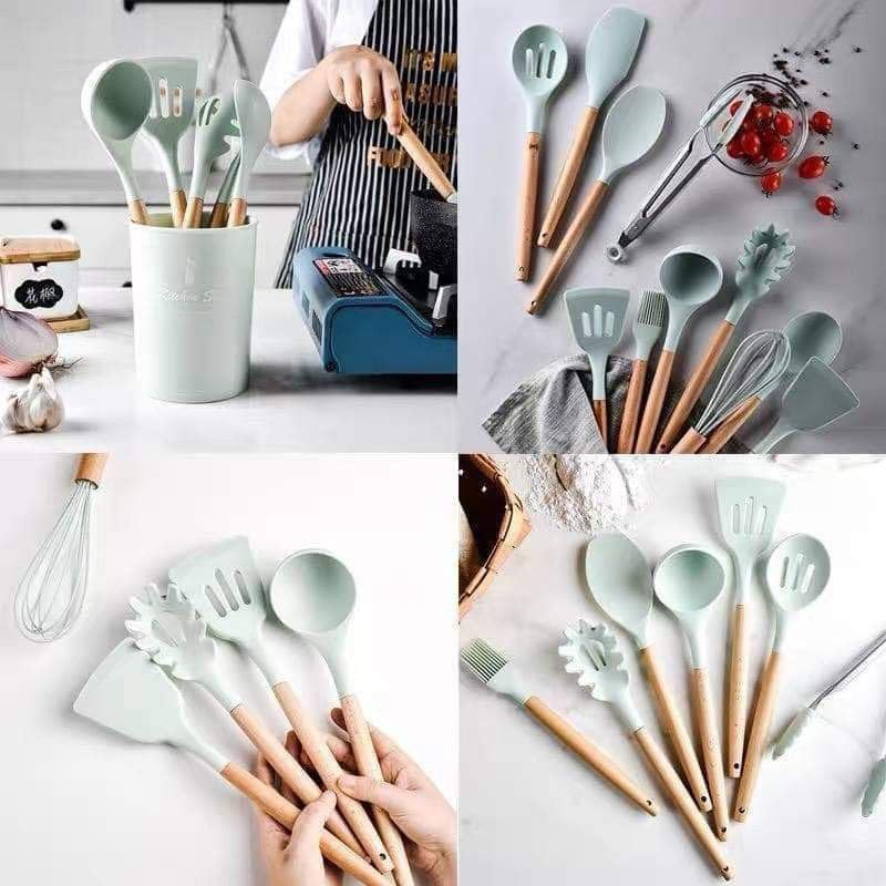Generic - طقم توزيع متكامل 12 قطعة – سيليكون حراري بيد خشب مع استاند أنيق SE (مينت)