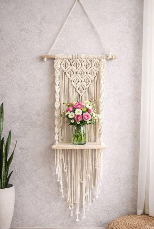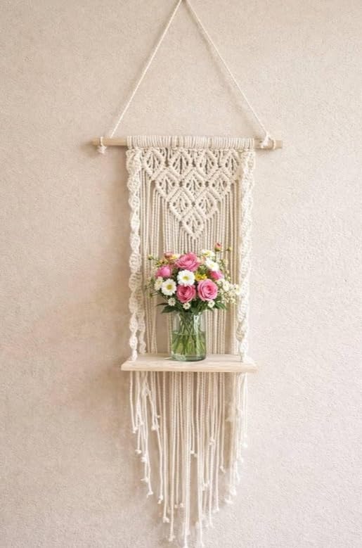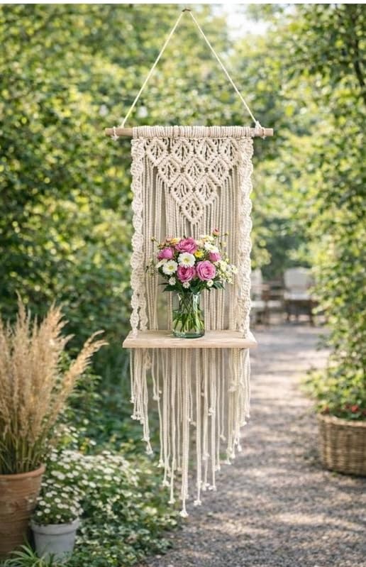 - تصميم فني مكرمية: رف تعليق مكرامية مصنوع يدويًا بتصميم هندسي جميل مع خيط طويل متدلي يضيف لمسة بوهيمية أنيقة إلى ديكور منزلك