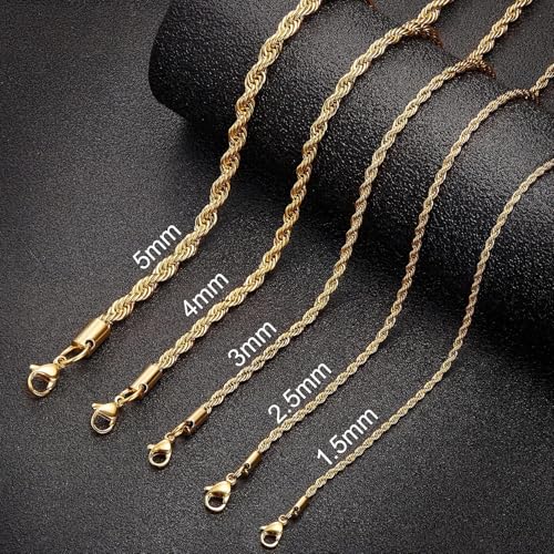 Monily - سلسلة بنمط حبل من الفولاذ المقاوم للصدأ، مطلية بالذهب الحقيقي عيار 18 قيراط، مقاس 1.5 و2.5 ملم و5 ملم، سلسلة حبل مناسبة للجنسين من الرجال والنساء، مقاس 40.6 سم و91 سم