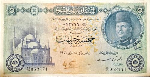Generic - ورقة نقدية بقيمة خمسة جنيهات صادرة عن البنك الأهلي المصري عام 1951 – الملك فاروق