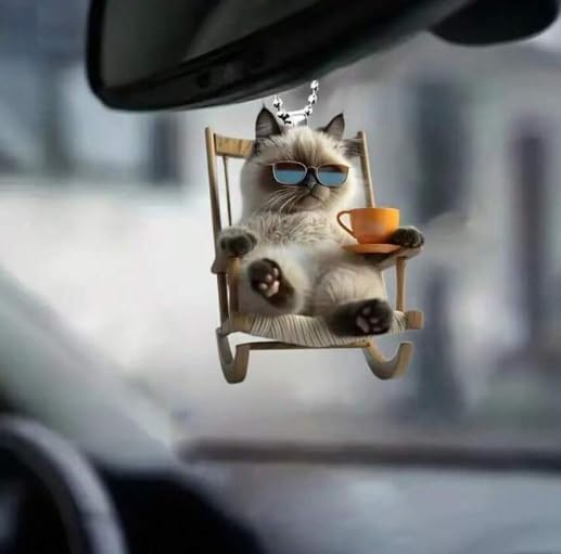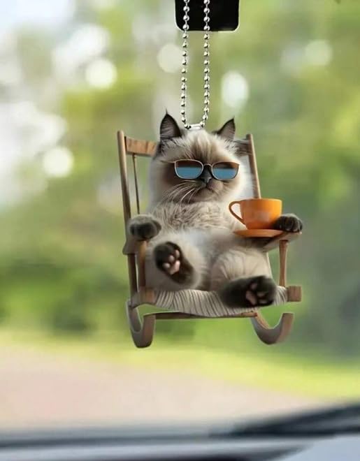 • تصميم مميز: زينة قطة متأرجحة لطيفة مصنوعة من الأكريليك المتين، تصور قطة مسترخية ترتدي نظارات شمسية وتحمل فنجانًا على أرجوحة خشبية.