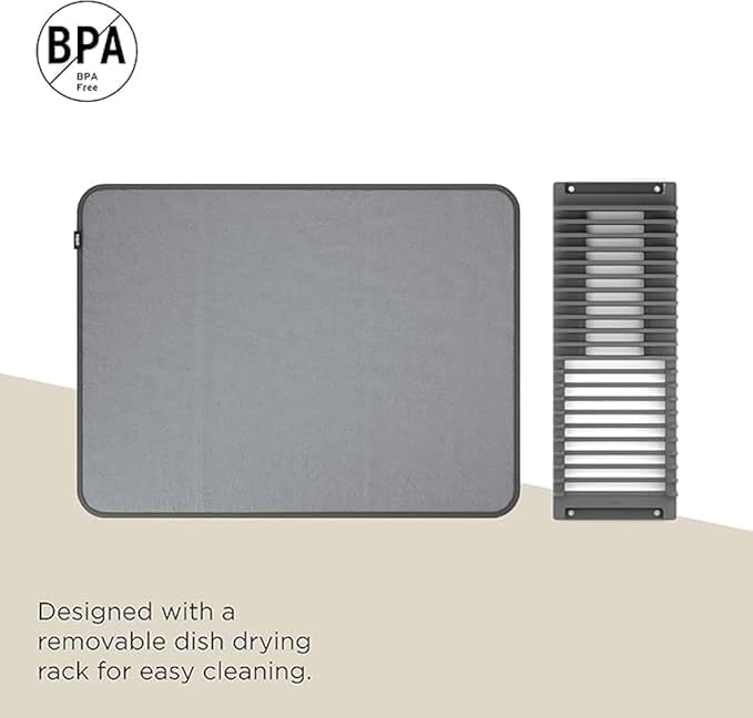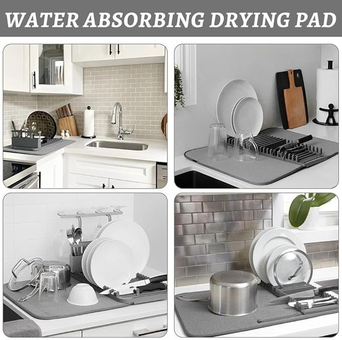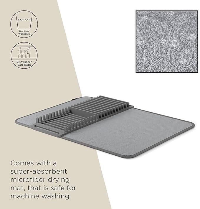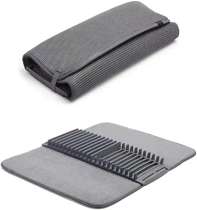 - تصميم مبتكر: يجمع بين رف تجفيف الأطباق وبساط المايكروفايبر في منتج واحد متعدد الوظائف للمطبخ
