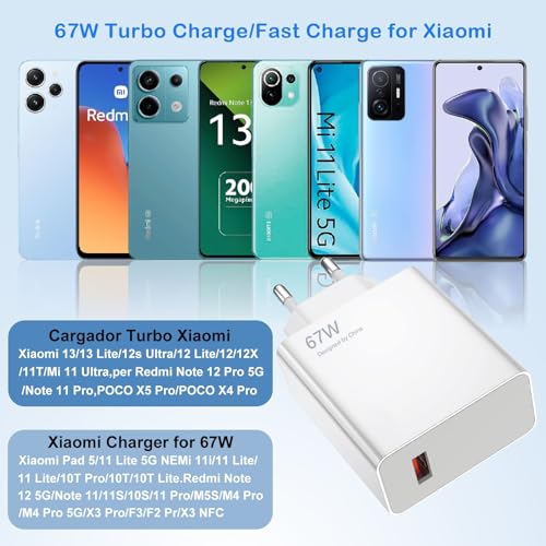 - 【شاحن سريع بمنفذ USB بقوة 67 وات لموبايل شاومي】: يأتي محول الطاقة بمنفذ USB هذا بقوة 67 وات مع كابل شحن سريع بطول 2 م مناسب لموبايلات شاومي ريدمي نوت 13 برو و12 برو شبكة الجيل الخامس 5G و11 برو شبكة الجيل الخامس 5G وبوكو X6 برو وبوكو M6 برو وبوكو X6 وبوكو X5 برو وبوكو F4 وبوكو F5 وبوكو كو F5 برو وشاومي ريدمي 13 و13 لايت و12 و12 لايت و12X و11T وباد 6 برو، وشحن تربو/ سريع بقدرة 33 وات لموبايلات شاومي ريدمي نوت 12 و11 و10 برو و10 و10S و11 لايت شبكة الجيل الخامس 5G و10T برو وبوكو X3 برو وبوكو F3 وبوكو X3 وبوكو X5 وغيرها.