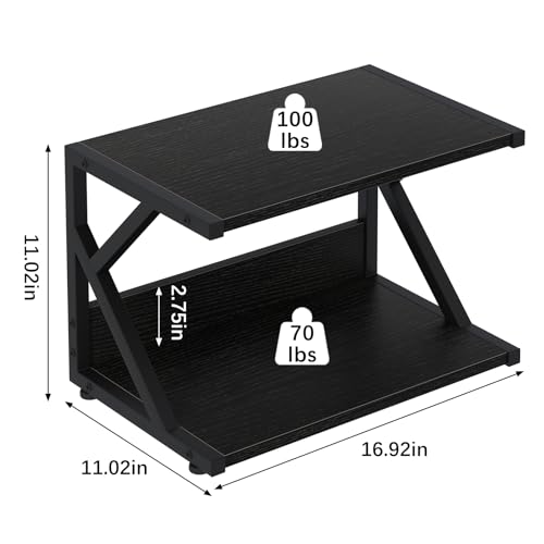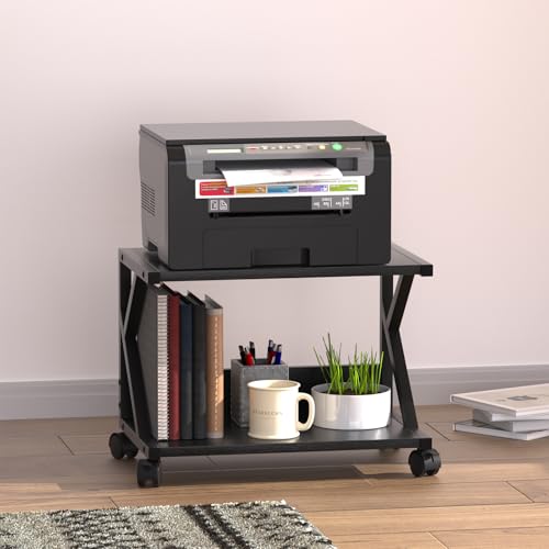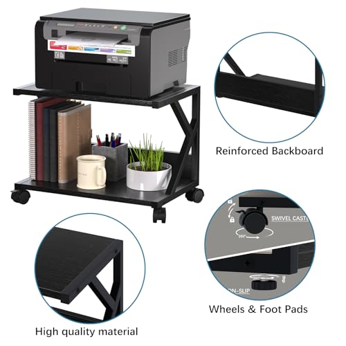 Huhote - حامل طابعة مكتبي من طبقتين، طاولة طابعة تحت المكتب، تخزين وتنظيم سطح المكتب متعدد الاغراض، حامل طابعة خشبي مع عجلات للمنزل والمكتب والماسح الضوئي والفاكس والمجلدات وفرن الميكروويف (اسود)