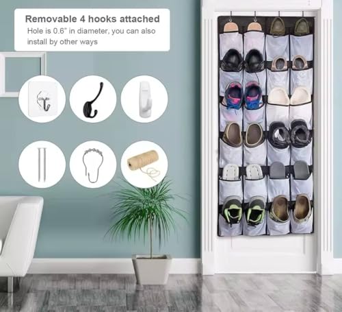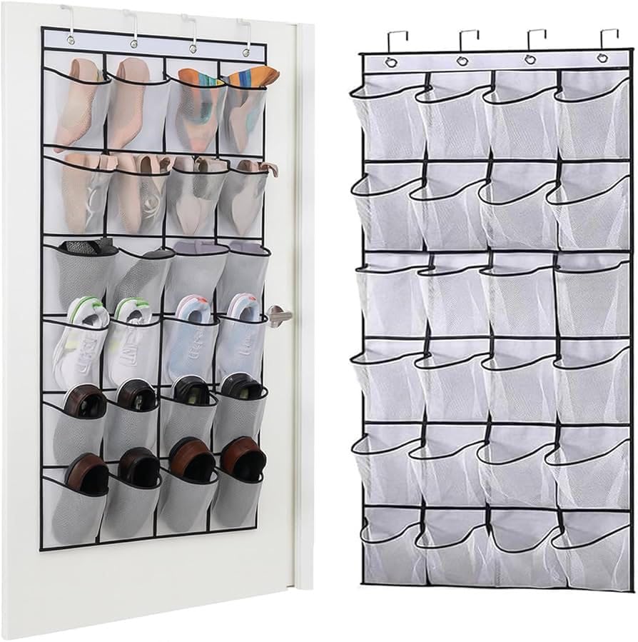 - تصميم متعدد الاستخدامات: منظم بـ 24 جيب يمكن تعليقه على باب الخزانة أو خلف الباب لتنظيم الأحذية والملابس والإكسسوارات بشكل مرتب وموفر للمساحة