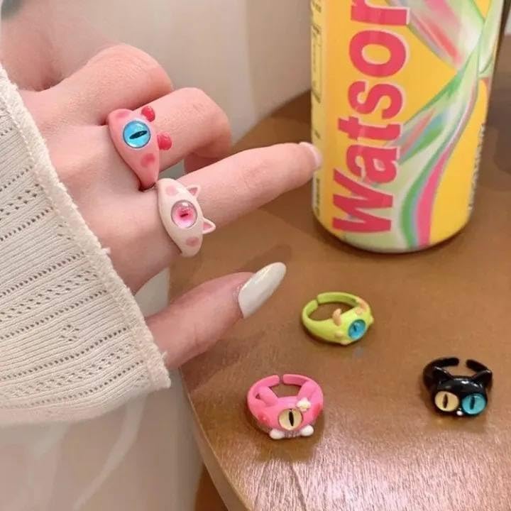 Generic - 2 قطعة خاتم لطيف ذو عيون كبيرة على شكل قطة للازواج، خواتم راتنج وحش للنساء، مجوهرات اكسسوارات كورية