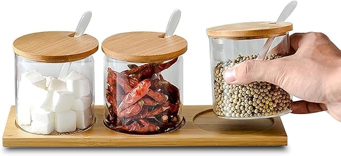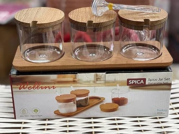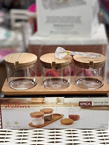 Generic - طقم برطمانات توابل مع اغطية من خشب علب شفافة لتخزين الطعام والسكر والملح والقهوة وحبوب الشاي (سعة 300 مل)، 3 قطع خمات عاليه الجوده عرض 2 عبوه