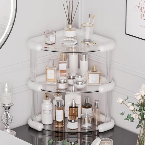 - مواد عالية الجودة: مصنوع من مواد بيضاء متينة مع أرفف شفافة تضيف لمسة عصرية وأنيقة لطاولة الزينة أو الحمام