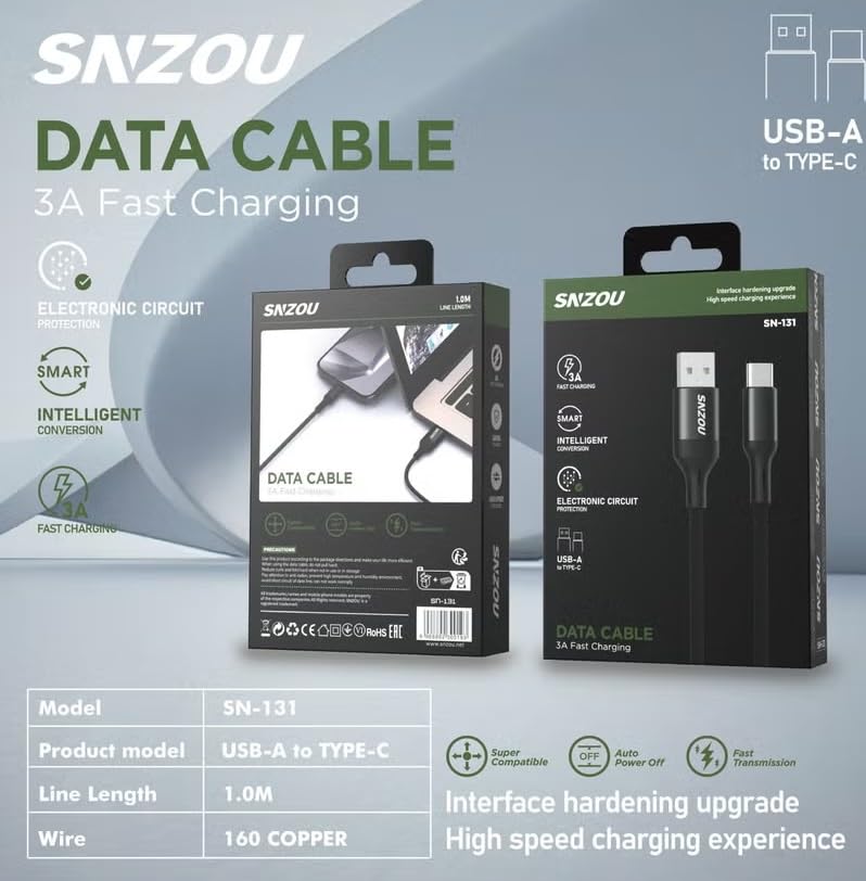 Generic - كابل شحن سريع 3A - يدعم إيقاف التشغيل التلقائي – متوافق مع أغلب الأجهزة – كابل بيانات لنقل سريع ومستقر للملفات – موديل SN-131