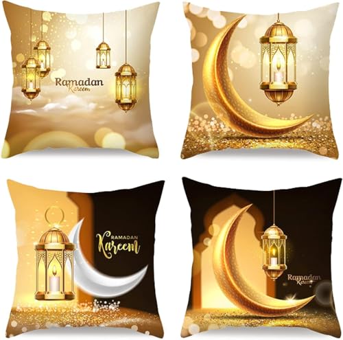 Generic - طقم اغطية كوشن مخدة بتصميمات رمضانية 4 قطع - اكياس مخدة ديكورات فانوس وهلال العيد للمنزل والكنب والسرير 45 × 45 سم