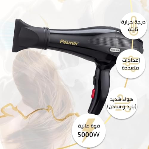 Generic - مجفف شعر احترافي قوي 5000 واط، يمنحك شعرًا ناعمًا كصالونات التجميل بسرعة وهدوء مع موزع هواء وفوهة قابلة للفك، خيارين للسرعة وثلاثة مستويات للحرارة بخاصية الحماية من الحرارة الزائدة PT-V5