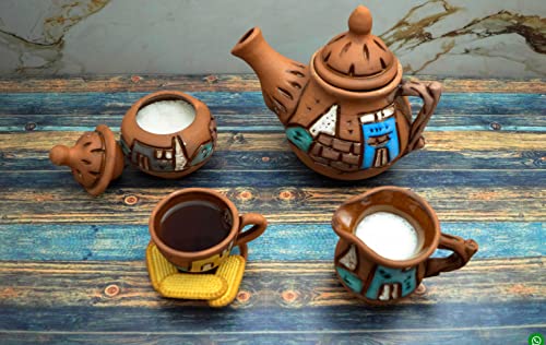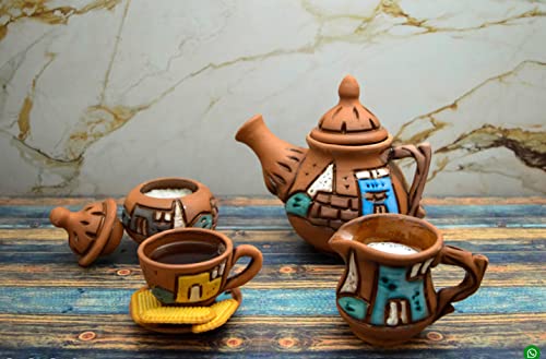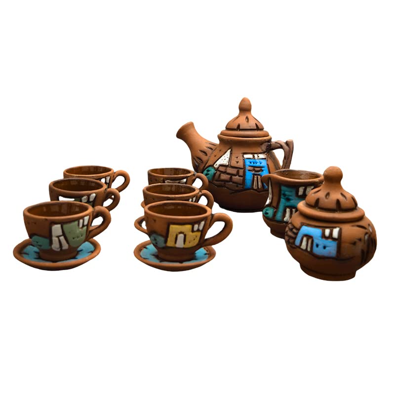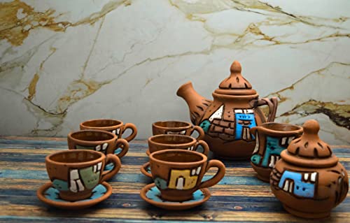 Egypt Antiques - طقم شاي مكون من 6 أكواب مع شفاطات ووعاء لبن ووعاء سكر وأكواب شاي فخار مصنوعة يدويًا ومعالجة بطبقة طلاء زجاجي طبيعية 100% وخالية من الرصاص