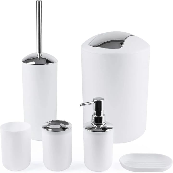 Generic - طقم اكسسوارات حمام 6 قطع باسكت بيضاوى بغطاء خشب بامبو فرشة حمام بالقاعدة دسبنسير صابون حامل فرش الأسنان حامل ادوات حلاقة صبانه (ابيض)