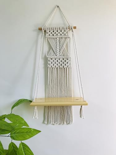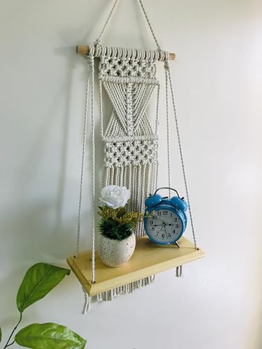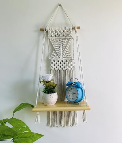 Generic - رف ديكور من خشب الموسكى الطبيعى معلق على جداريه منسوجه من خيوط المكرميه 60x33x14 سم