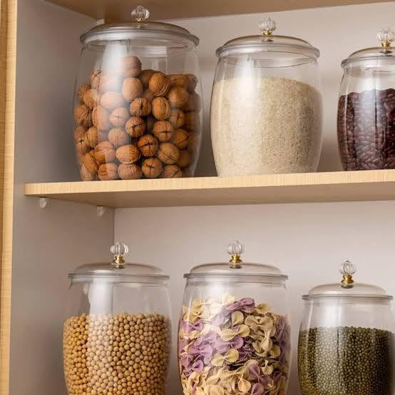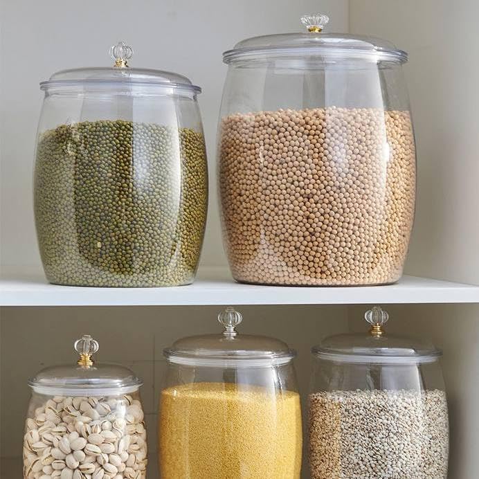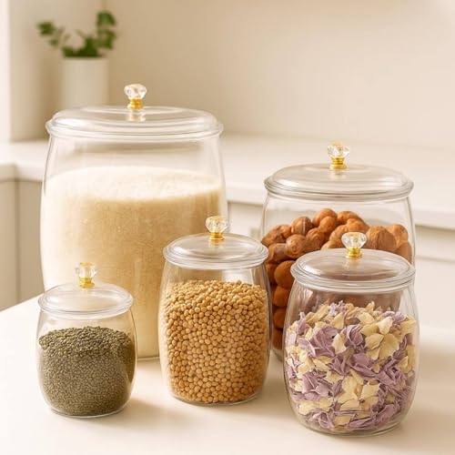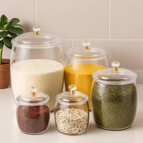 - COMPLETE KIT: Set of 5 clear acrylic storage cans in different sizes, perfect for storing legumes, nuts and grains