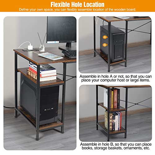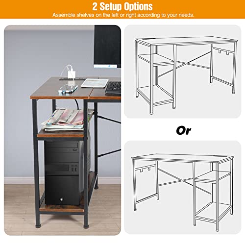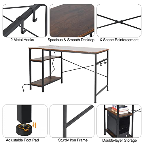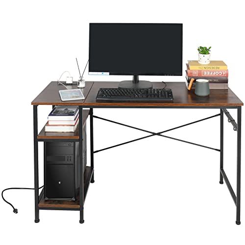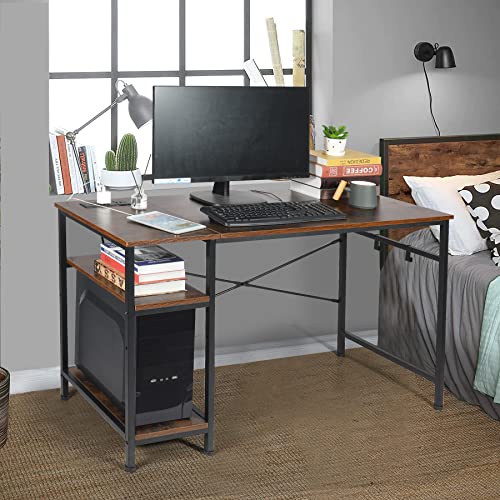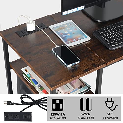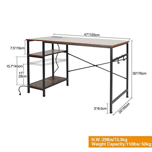 AKVOMBI - مكتب كمبيوتر متر و20 سم مع أرفف قابلة للتعديل ومنفذ طاقة من اكفومبي، مكتب كتابة صغير للمساحات الصغيرة، مكتب منزلي صناعي مع منفذ USB، أرفف تخزين قابلة للعكس، خطافين، بني ريفي