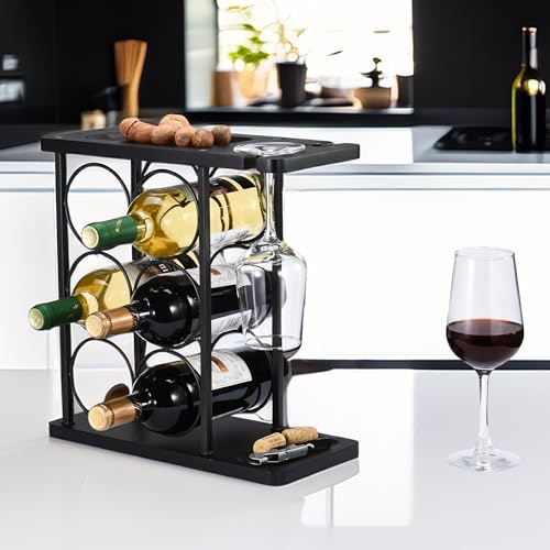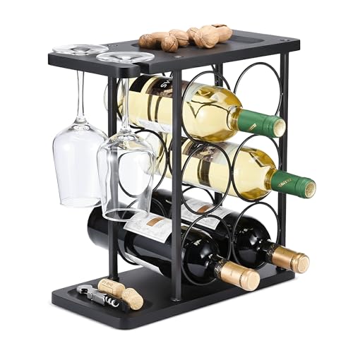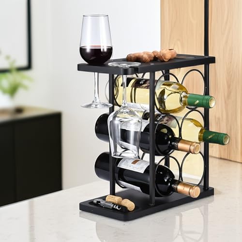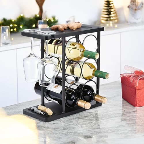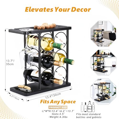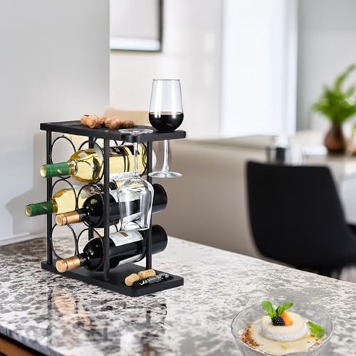 ALLCENER - اولسينير رف مشروبات عصري لسطح المنضدة، رف مشروبات 6 زجاجات اسود غير لامع مع حامل زجاج، حامل معدني للنبيذ مع رف وصينية على شكل مفتاح للمنزل والبار والمطبخ