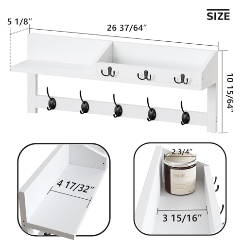 AMBIRD - ايه ام بيرد خطافات حائط مع رف 26.5 انش خشبي للتعليق على الحائط للمعاطف يثبت 5 مزدوجة و3 مفاتيح ومنظم بريد وحامل ابيض بامبو 66.0 رطل 66.0