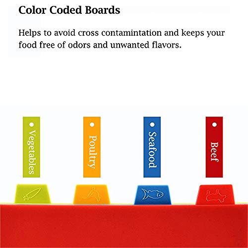 - طقم ألواح تقطيع - 4 ألوان للتصنيف، يُقدم هذا الطقم تصنيفًا رباعيًا للأطعمة، حيث يتم فصل اللحوم النيئة عن الأطعمة المطبوخة، والخضروات والفواكه، والمأكولات البحرية. يضمن هذا التصنيف الغذائي نظافة أكبر، حيث يمنع انتقال البكتيريا بين الأطعمة النيئة والمطبوخة. كل لوح مُعلّم لتعرف أيّ واحد تستخدمه. يتناسب بشكل مثالي في الزاوية، ويضيف القليل من الألوان إلى المطبخ الآن!