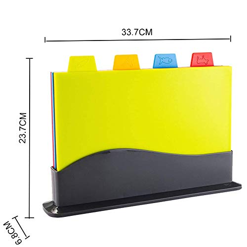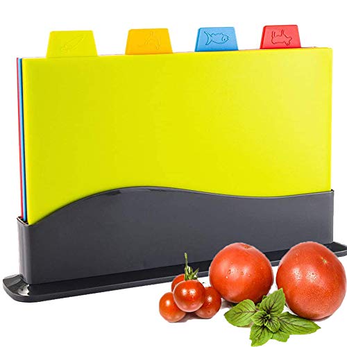 AMERTEER - مجموعة ألواح تقطيع للمطبخ، مجموعة من 4 ألواح تقطيع بلاستيكية صغيرة غير قابلة للانزلاق مع أيقونة طعام مرمزة بالألوان في حامل تخزين موفر للمساحة من اماتير