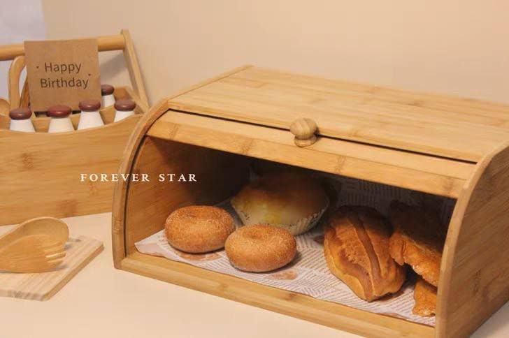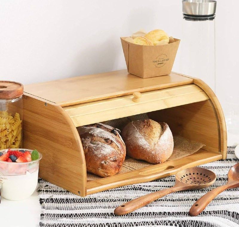 - تصميم فاخر: صندوق تخزين خبز من الخيزران الطبيعي مع باب منزلق علوي ملفوف وغطاء خشبي صغير لسهولة الوصول والحفاظ على الطعام طازجًا