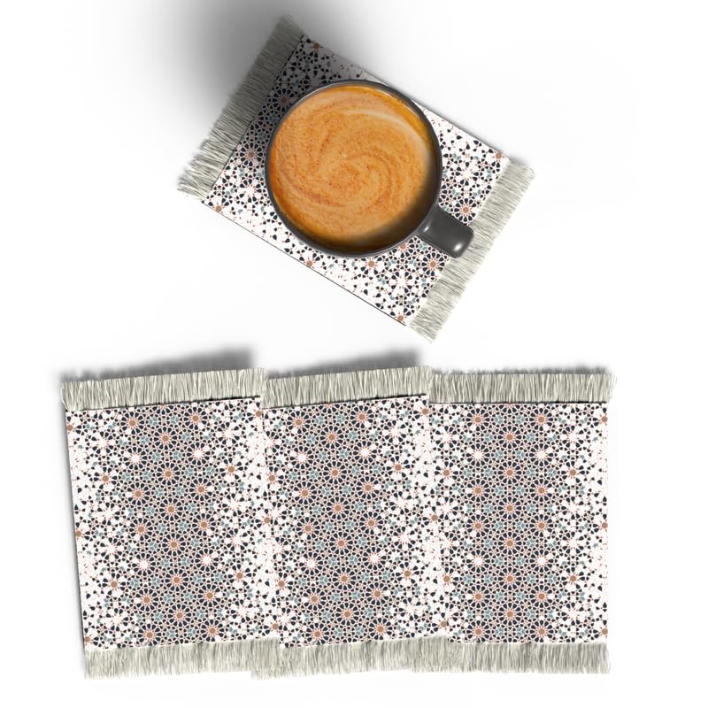 • ناعمة وفاخرة: تتميز قواعد الأكواب بسطح مخملي مصنوع من نسيج مزيج من البوليستر والمايكروفايبر، والذي يعطي شعورًا بالنعومة الفائقة عند اللمس. يضيف هذا الملمس المخملي لمسة من الفخامة إلى حياتك اليومية.
