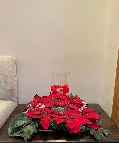Generic - مجموعة زهور البوينسيتيا الحمراء الصناعية مع فازة زجاج، ديكور لحفلة الكريسماس بنمط زهور لامعة وشريط من القماش القطن وزينة مركزية لسطح الطاولة