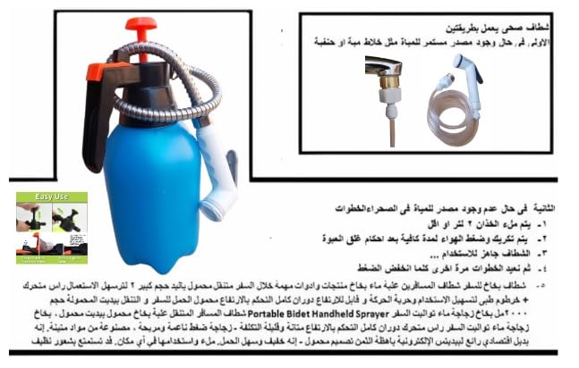 - شطاف محمول للمسافر يعمل فى ظل وجود مصدر مياة مستمر وايضا فى حال عدم وجود مصدر للمياة بالضغط بخرطوم 2 متر . سهل الاستخدام فى جميع الاماكن حتى فى الصحراء. عبوة 2 لتر صالحة للعمل بالضغط المستمر للهواء كود 1
