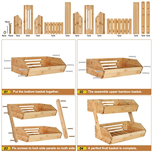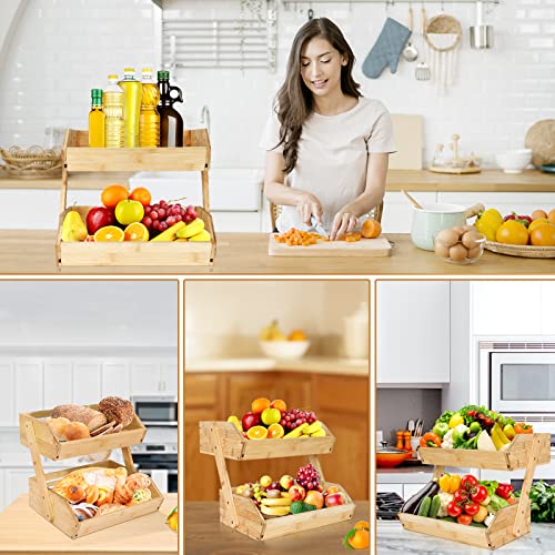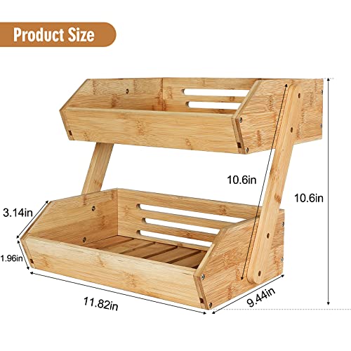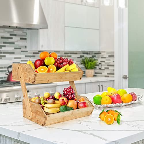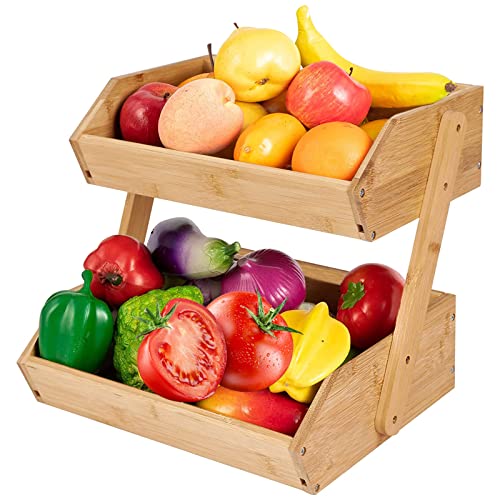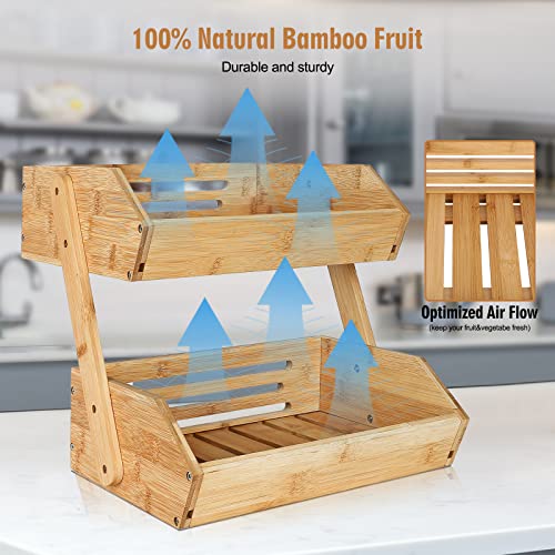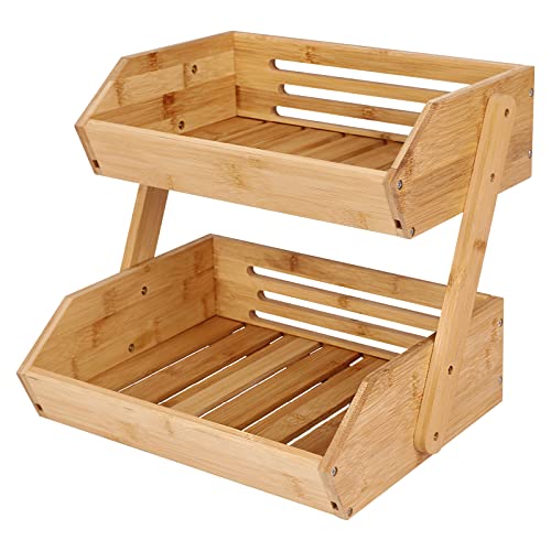 ATTGREAT - سلة فاكهة من الخيزران من اتجريت، وعاء فاكهة بطبقتين للمطبخ والترابيزة وتخزين الخضروات والمنتجات وتنظيم الاسطح، بني
