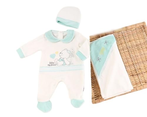 Generic - طقم سالوبيت قصير للأطفال البيبي مكون من 3 قطع، سالوبيت قصير بتصميم دب وطاقية وبطانية متطابقة