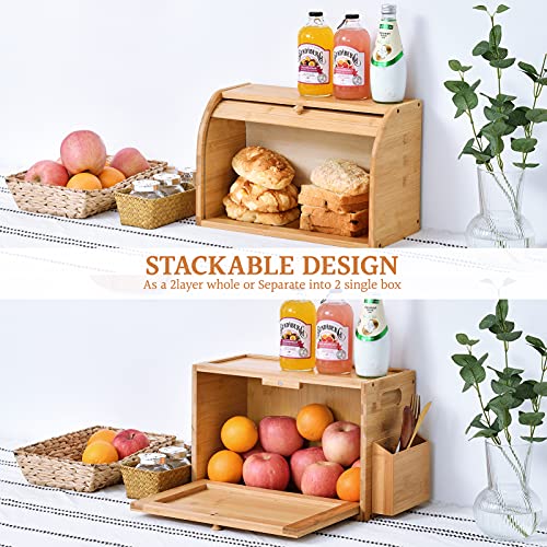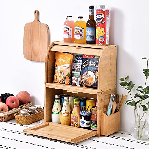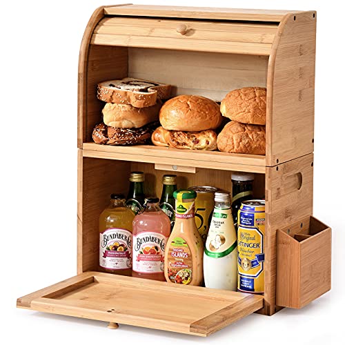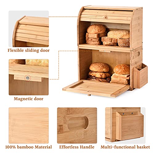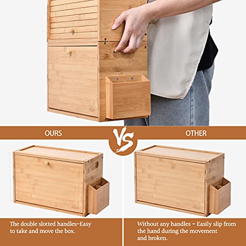 MUNANGO NATURAL LIFE - صندوق خبز من البامبو، صناديق تخزين الخبز من طبقتين لطاولة المطبخ، علب حفظ الخبز بسعة كبيرة، صندوق خبز علوي قابل للإزالة، مع سلة فضية اللون، 38 × 25 × 50 سم، (تركيب ذاتي)