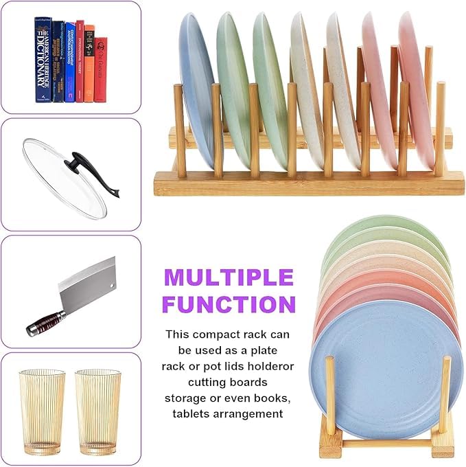 • تصميم متعدد الاستخدامات: رف خشبي لحمل الأطباق متعدد الوظائف مثالي لتنظيم الأطباق والأكواب والمجات وأدوات المائدة وحتى الكتب بفضل الفتحات الرأسية القابلة للتكيف