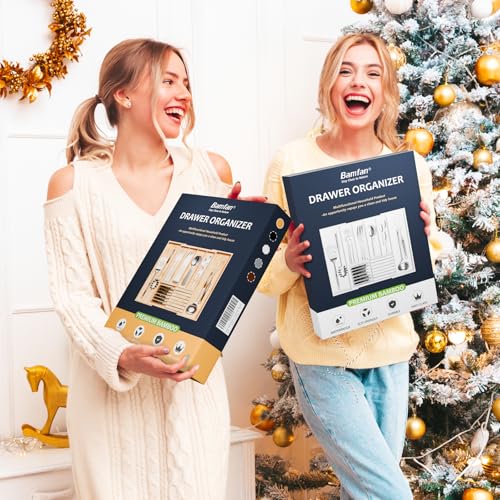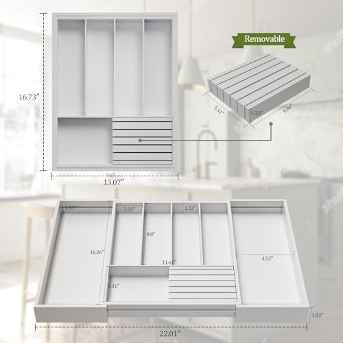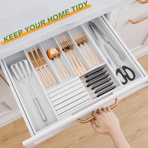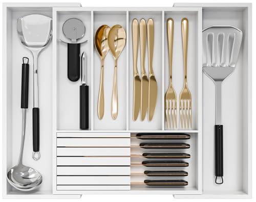 Bamfan - منظم درج فضيات المطبخ من البامبو وحامل أواني خشبي قابل للتوسيع مع فواصل وصينية تخزين أدوات مائدة لأواني المطبخ والمسطحات مع 5-7 فتحات وحامل سكاكين قابل للإزالة لون أبيض