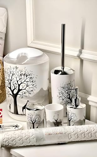 - يتضمن التصميم الشامل 6 عناصر أساسية - زجاجة لوشن مع مضخة وحامل فرشاة أسنان وكوب شطف وصبانة وسلة مهملات صغيرة وفرشاة استحمام - مما يوفر تنظيمًا كاملاً يعزز ديكور حمامك.