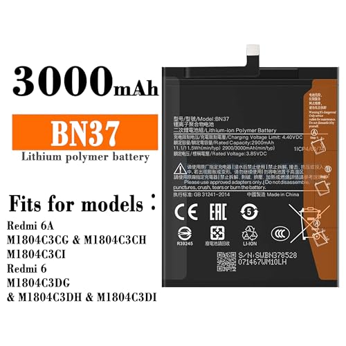 - سعة عالية 3000 مللي أمبير في الساعة: توفر سعة البطارية 3000 مللي أمبير في الساعة وقت استخدام طويل متوافق مع موبايل شاومي ريدمي 6 / ريدمي 6 ايه (ريدمي 6 ريدمي 6 ايه بي ان 37)