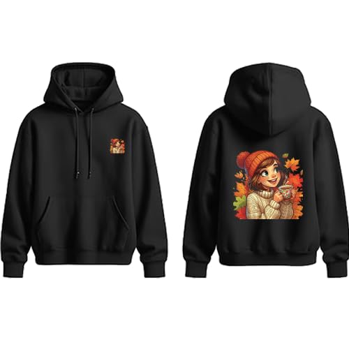 Generic - هودي اسود مع رسومات خريفية للبنات بجيب امامي ورباط مقاس (L)