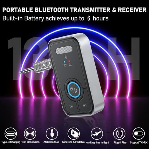 - 👜 - 【تصميم صغير الحجم ويدوم طويلًا】يتميز محول بلوتوث اوكس هذا بتصميم صغير الحجم ومحمول، مما يجعل من السهل حمله في أي مكان. يتميز ببطارية ليثيوم مدمجة قابلة لإعادة الشحن مع شحن سريع عبر منفذ USB نوع C، ويتم شحنه بالكامل في غضون ساعة إلى ساعتين. يعمل لمدة 6 ساعات تقريبًا في وضع الاستقبال (RX) و3.5 ساعة في وضع الإرسال (TX). ومن المريح أنه يمكن استخدام محول اوكس أثناء الشحن.