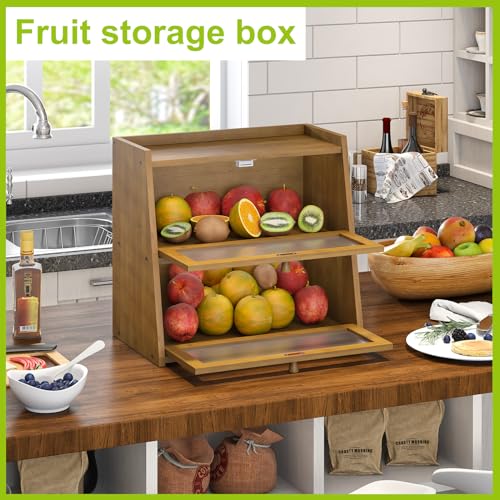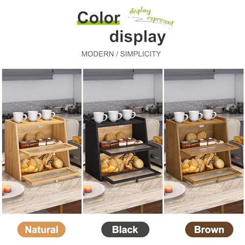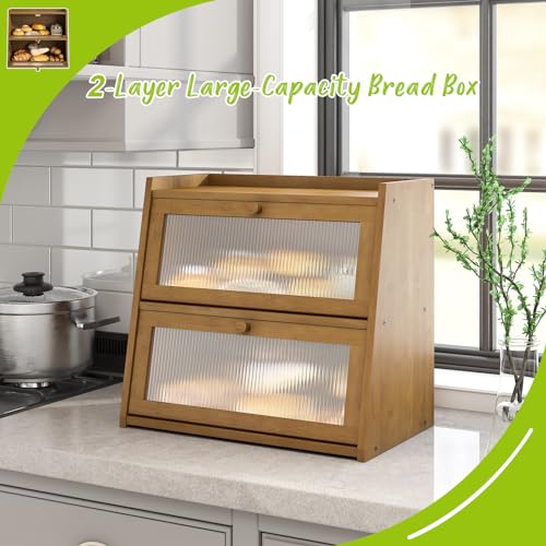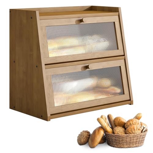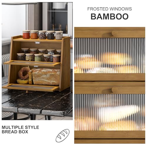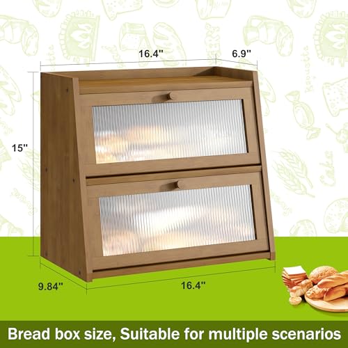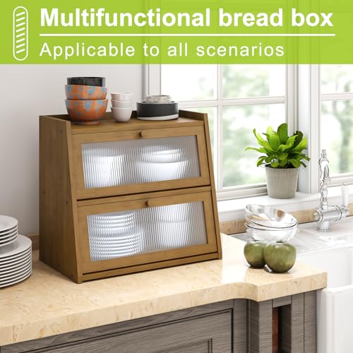 BMOSU - بي موسو صندوق خبز كبير لتخزين وتنظيم الخبز في المطبخ، صندوق خبز بتصميم ريفي مع نافذة زجاجية مصنفرة، صندوق خبز من الخيزران ذاتي التجميع بطبقة مزدوجة (بني)