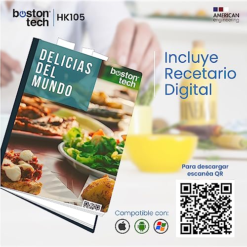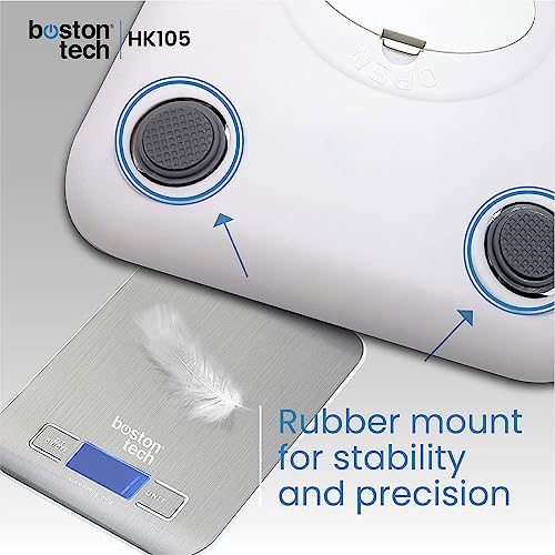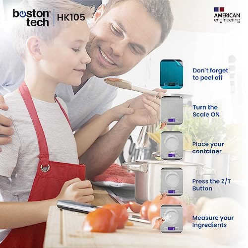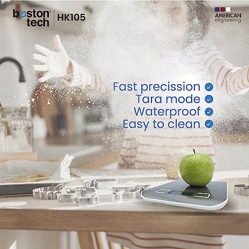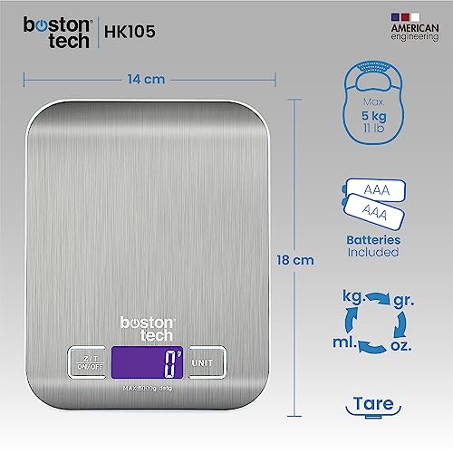 Boston Tech - ميزان مطبخ رقمي عالي الدقة ومتعدد الوظائف من فولاذ مقاوم للصدأ بتصميم للماء سعة 5 كيلوجرام مزود بشاشة LCD وبطاريات ووظيفة وزن فارغ وكتاب وصفات قابل للتنزيل توافر اللغة العربية غير مؤكد HK105