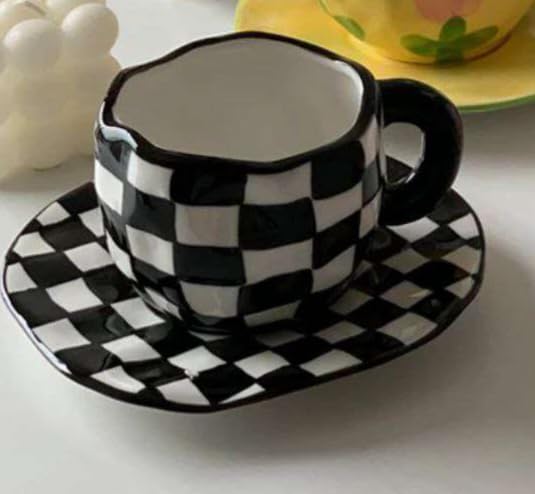 Generic - طقم فناجين شاي وصحون بنقشة مربعات من السيراميك باللونين الأسود والأبيض، تصميم بنقشة سباق، مجموعة تقديم القهوة