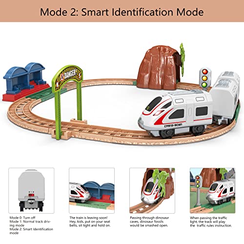 • لعبة قطار لتعلم مهارات العلوم والتكنولوجيا والهندسة والرياضيات مع صوت وضوء: وضع تعليمي للتعرف الذكي: سيتم تنشيط وظيفة التحسس الذكي، عندما تمر القاطرة بنقطة التعريف الذكية، سيتوقف القطار الصغير تلقائيًا ويقوم بإصدار عبارات صوتية مطابقة للمشهد. يمكن لمجموعة القطار المزودة بمحرك تحديد ما يصل إلى 7 سيناريوهات مختلفة للمسارات بذكاء عند شراء مجموعة المسارات القابلة للتوسيع.