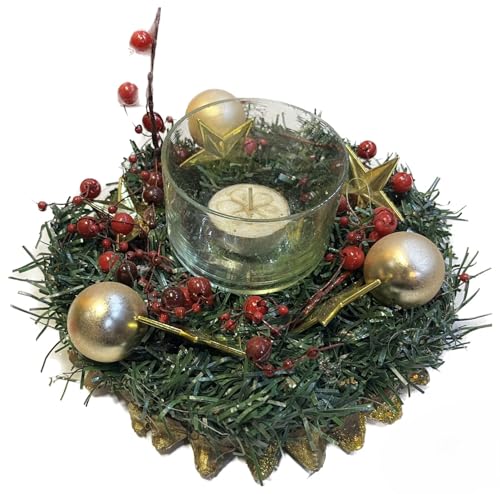 Generic - حامل شموع الكريسماس مع زجاج فوتيف، إكليل صنوبر صناعي، توت أحمر، زينة ذهبية، نجوم، ديكور طاولة العطلات