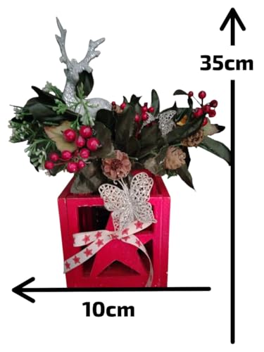 Generic - ترتيب عطلة الكريسماس، صندوق خشبي احمر مع توت هولي اصطناعي، مخاريط صنوبر، فيونكة فضية، قطعة مركزية مزخرفة 35 سم × 10 سم