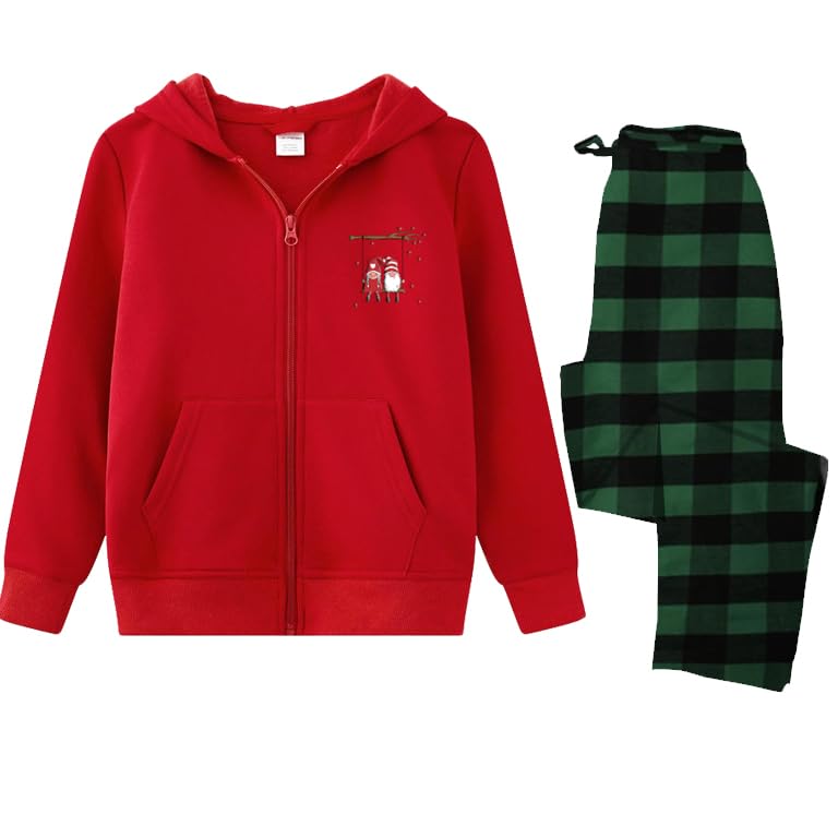 Generic - طقم بيجامة للكريسماس، هودي بسحاب احمر مع سروال بنمط مربعات خضراء، مقاس (M)