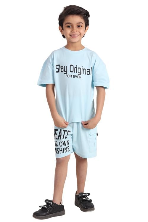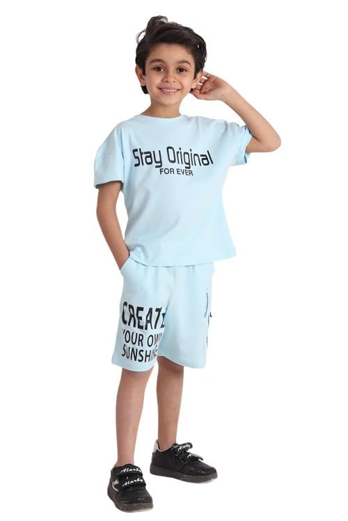 Choice N.C - طقم صيفي ليكرا قطن بناتي وولادي تيشيرت نص كم وشورت خامة مرنة ومريحة لبس بيت او خروج تصميم بسيط والوان عصرية عملية للاطفال code 702